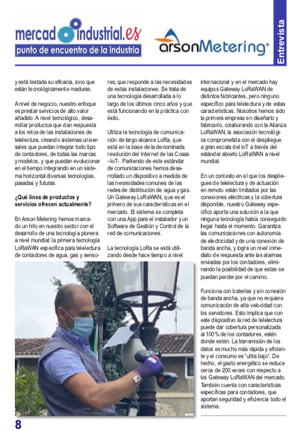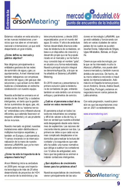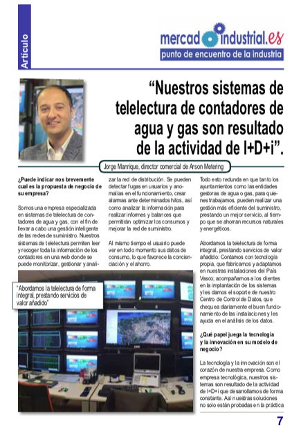 La revista especializada en el sector industrial y empresarial, Mercado Industrial, nos dedica tres páginas en su número de noviembre con una entrevista a Jorge Manrique, director comercial de Arson Metering.